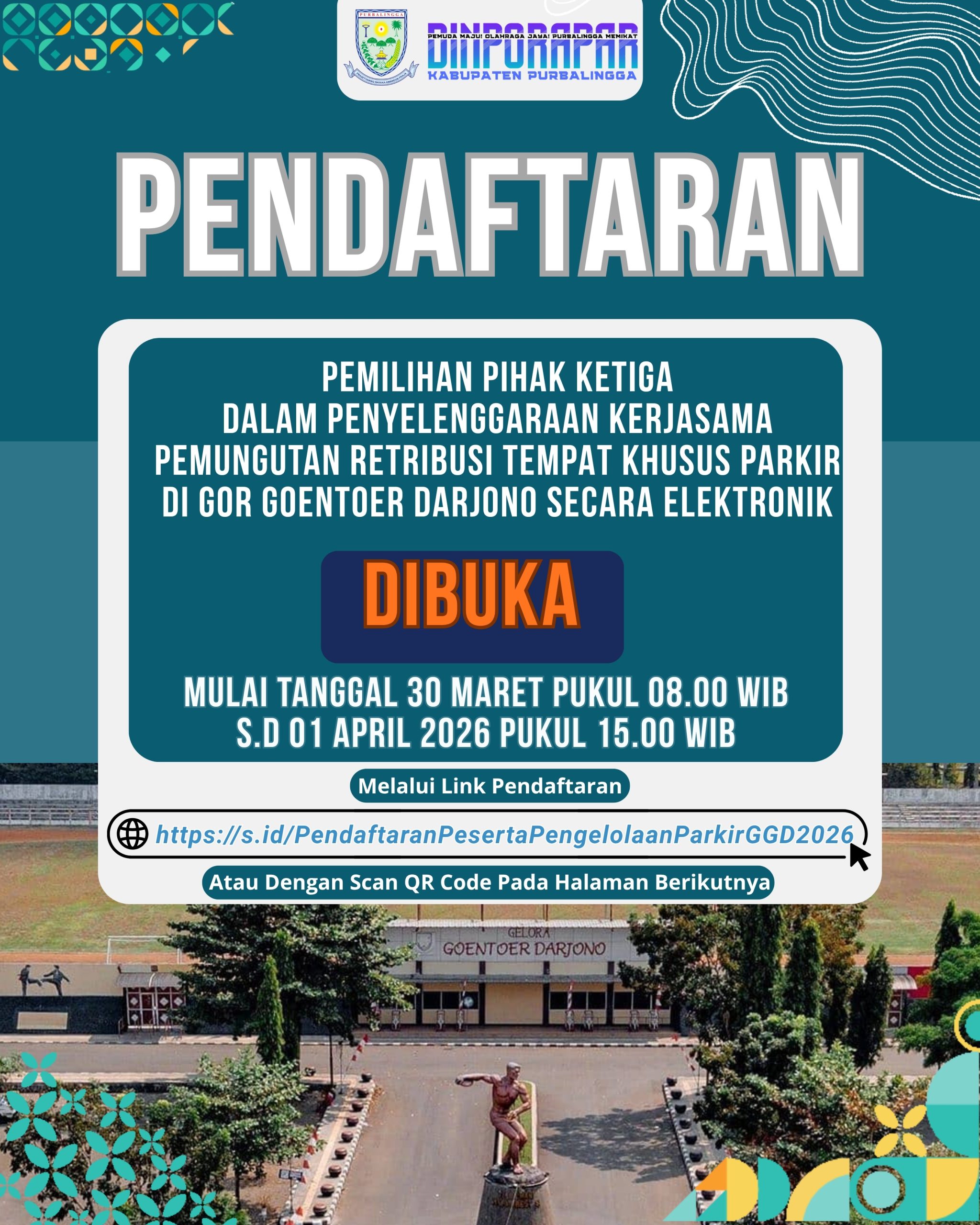Pemilihan Terbuka Pihak Ketiga dalam Penyelenggaraan Kerjasama Pengelolaan Tempat Khusus Parkir di GOR Goentoer Darjono Secara Elektronik dibuka.